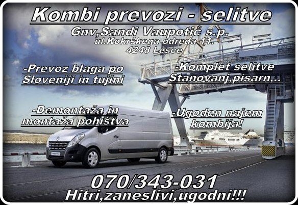 Nudimo vam ugodne kombi prevoze in selitve po Ljubljani in širšo okolici. Smo hitri, ugodni in zaneslivi! Za več informacij pokličite na 070/343-031 ali 040/455-477